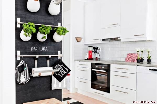 Hãy thử nhìn cách ngôi nhà này tận dụng mảng tường nhỏ treo các dụng cụ làm bếp và chậu cây xanh nhỏ trang trí thêm cho không gian sống cực kì mới lạ. Một ý tưởng vừa mới, lại rất tiết kiệm tiện tích lưu trữ đồ, phải không?